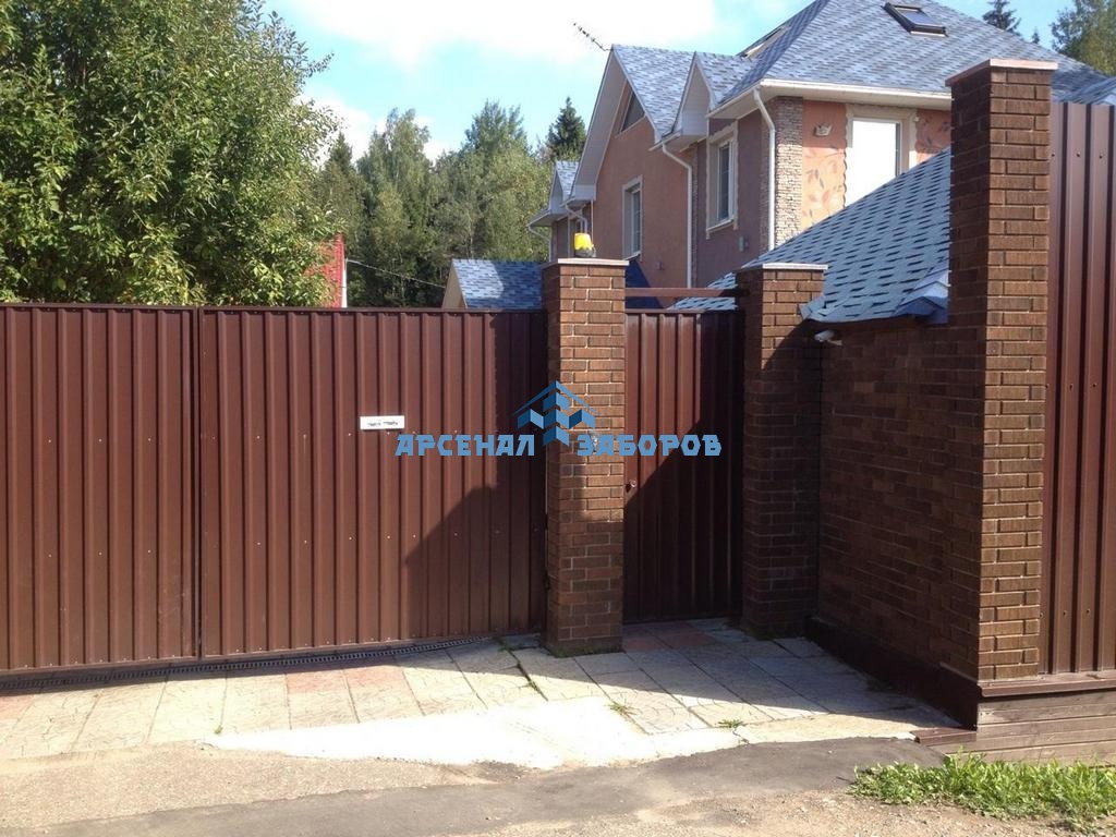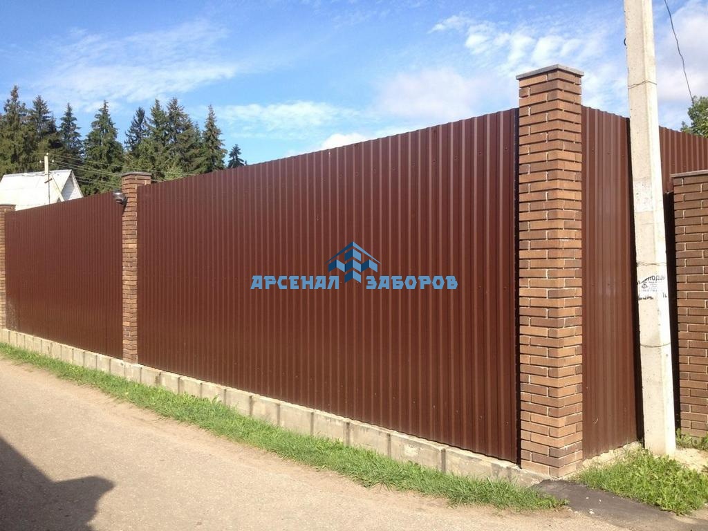 Забор из профнастила с кирпичными столбами 115 метров в Чекалине