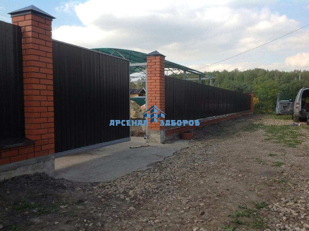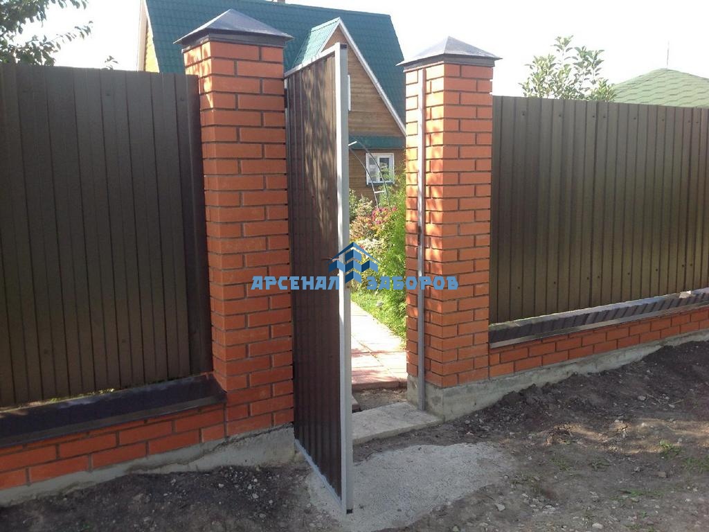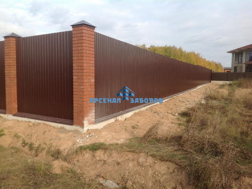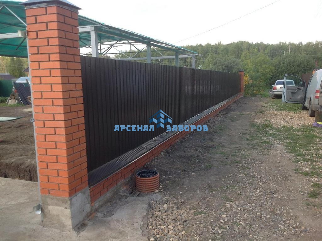 Конструкция забора из профлиста на ленточном фундаменте и с кирпичными столбами